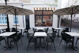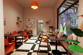 Mit sorgfältig ausgewählten Möbelstücken, wie den ikonischen orangefarbenen Panton-Stühlen, warmen Holzoberflächen und dezenter Begrünung schafft das Interieur mühelos eine Atmosphäre, die Wärme mit moderner Ästhetik verbindet. Der grafische Schachbrettboden unterstreicht das stilvolle und entspannte Ambiente und lädt die Gäste ein, bei Kaffee, kleinen Gerichten und dem Genuss der Langsamkeit zu verweilen.